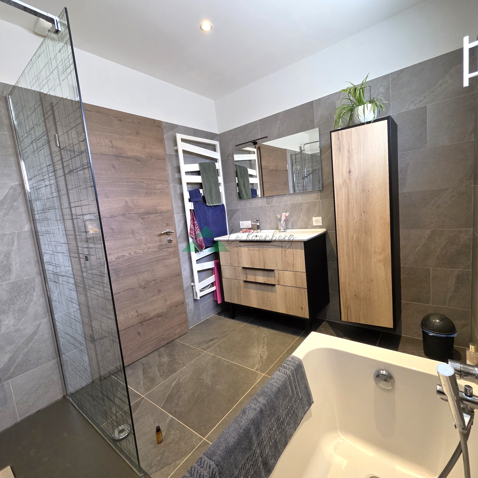 Elle comprend : une entrée, une buanderie/chaufferie, un espace de vie orienté sud-ouest de 43,5m², un bureau, ainsi qu'un dégagement desservant 2 chambres, un wc, une salle-de-bains avec douche et baignoire.