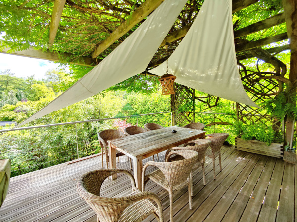 - à l'extérieur : une belle terrasse accessible depuis le séjour avec vue verdoyante. Un escalier vous mènera à une seconde terrasse à l'ambiance lounge et détente grâce à son spa. Vous pourrez également accéder à l'espace indépendant du rez-de-sol.