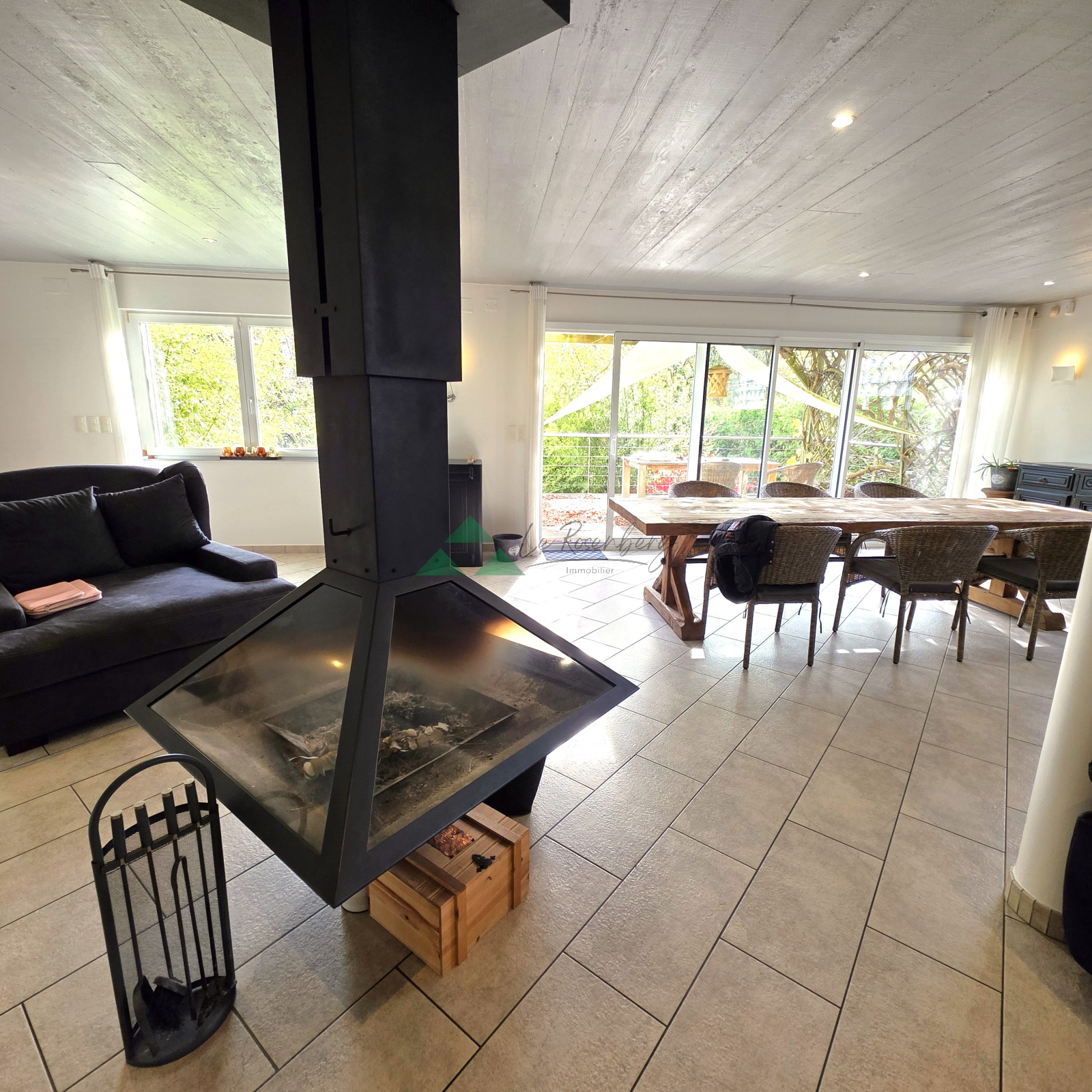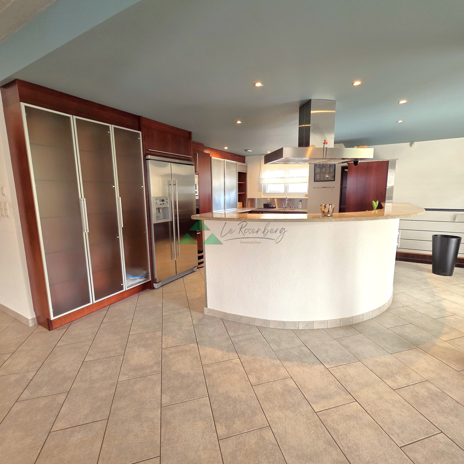 - au rez-de-chaussée : un garage deux voitures, un cellier, un hall d'entrée et surtout un incroyable espace de vie de près de 130m² avec cuisine toute équipée haut-de-gamme (réfrigérateur américain, cave à vin) et poêle suspendu. Vous pourrez créer l'ambiance qui vous plaira en y ajoutant par exemple un billard, un coin bureau ou bibliothèque. Cet étage est parfait pour des moments de convivialité.