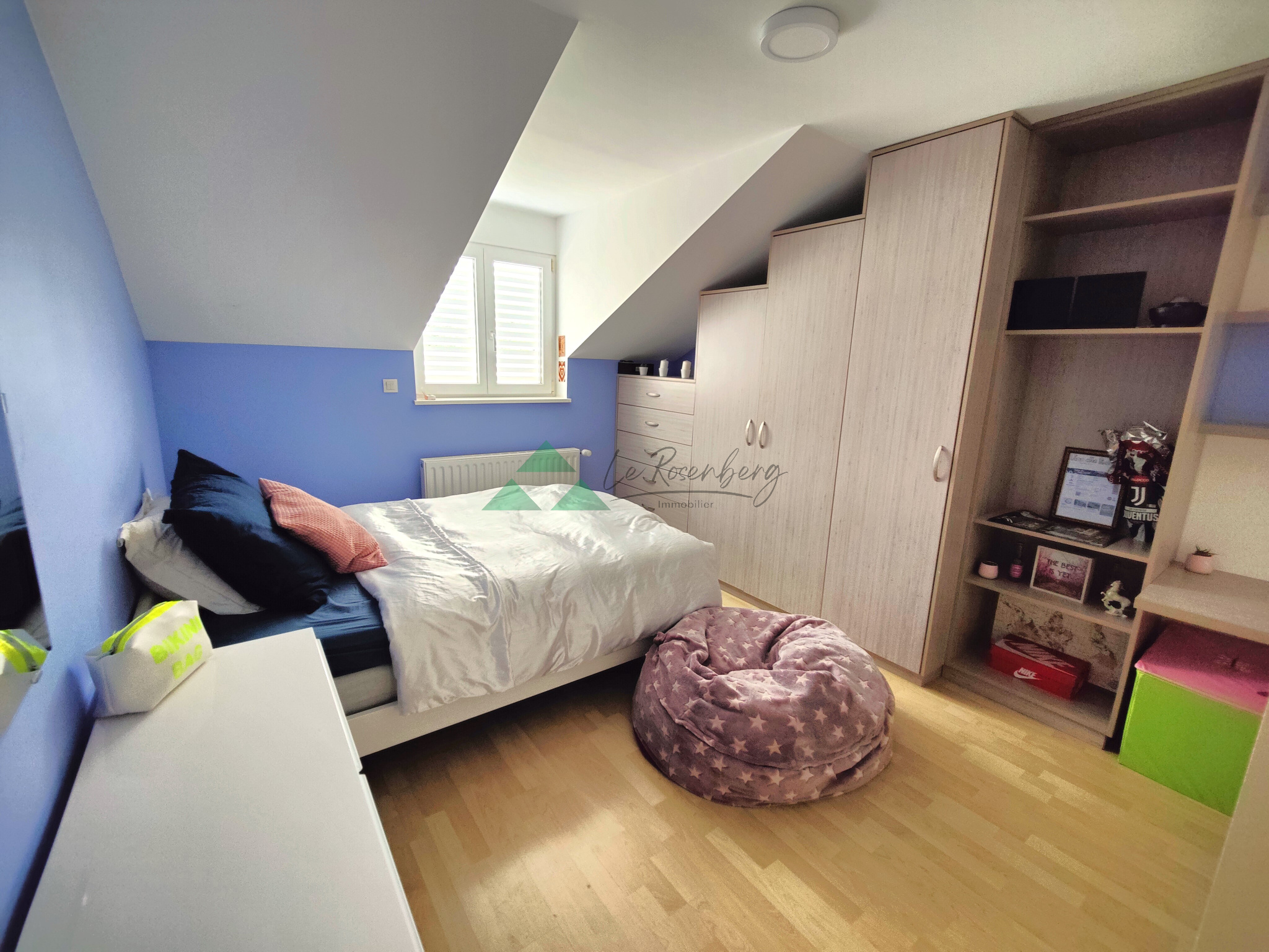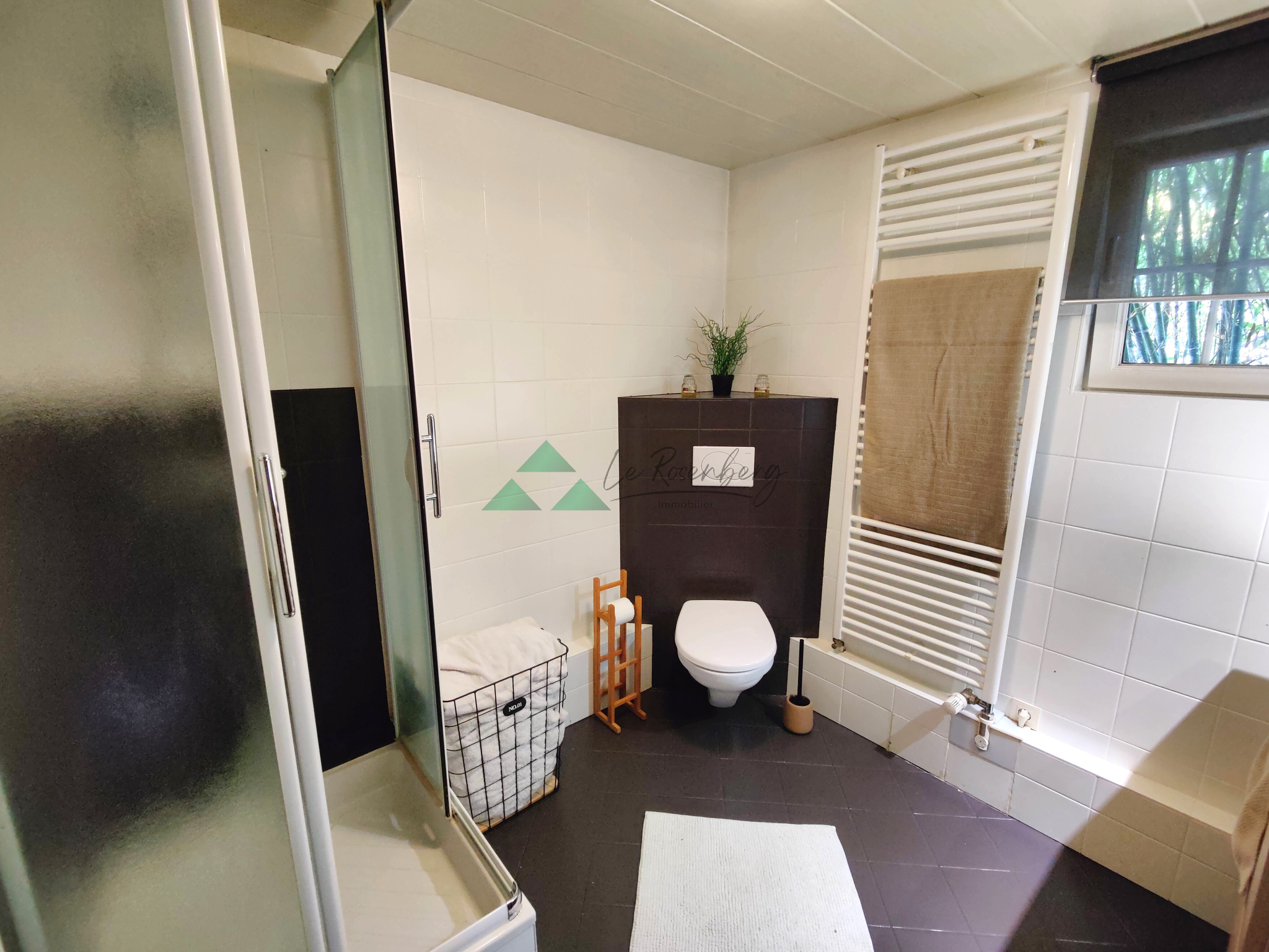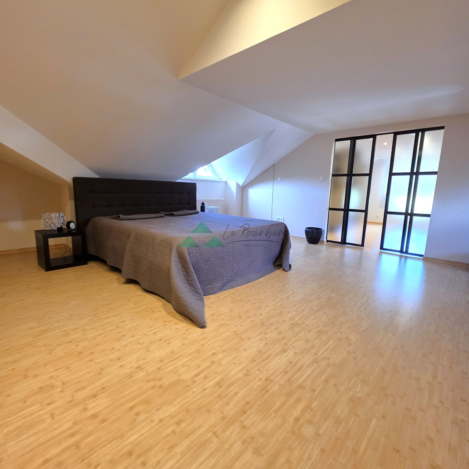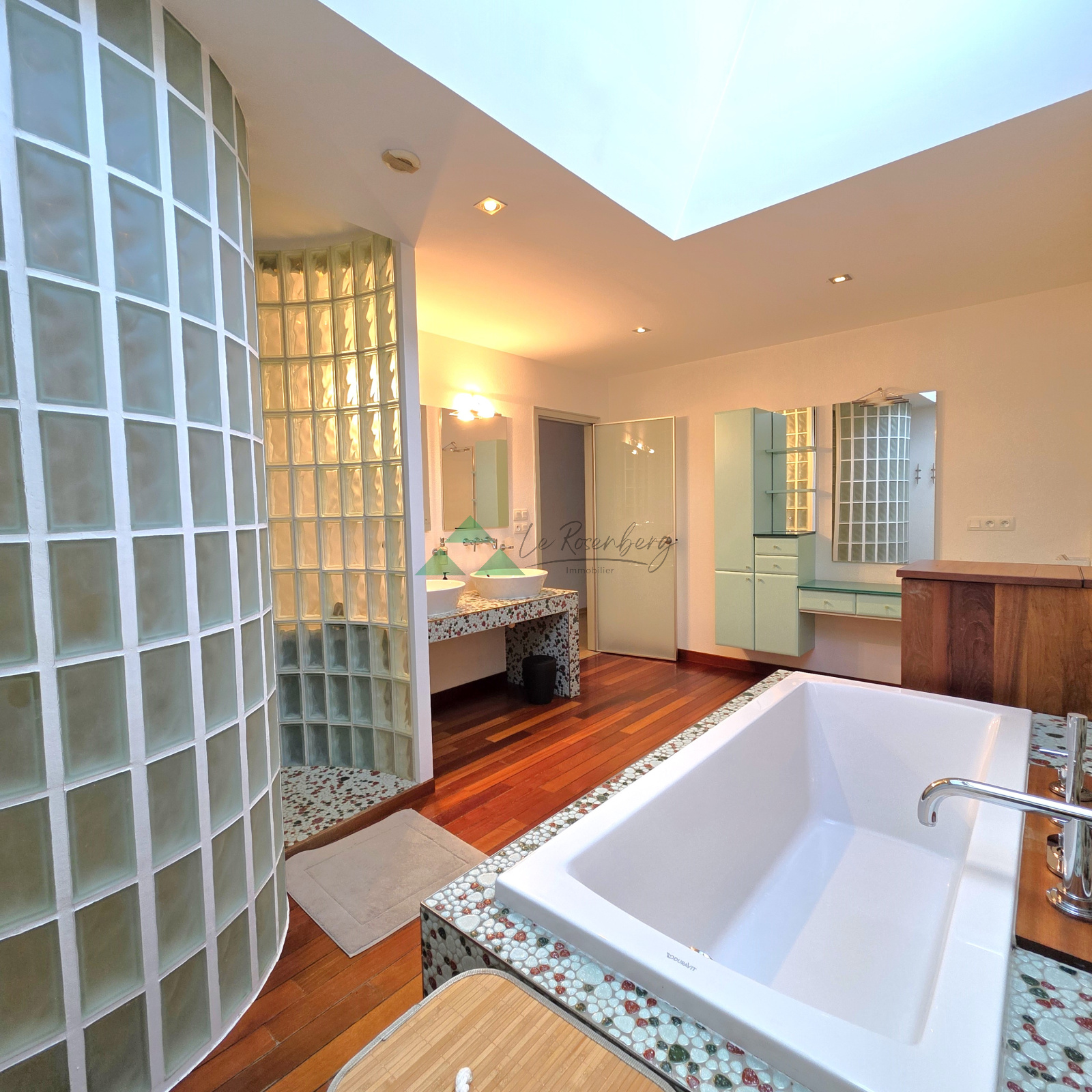 - à l'étage : un dégagement dessert 4 chambres dont 1 parentale avec un dressing de rêve, un espace TV ou bureau, une salle-de-bains stylée de 14m² avec douche en brique de verre, baignoire et puits de lumière, un wc. Cet étage est dédié à la famille.
