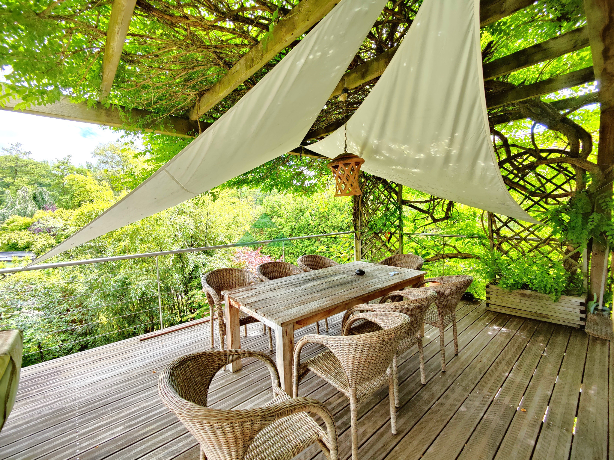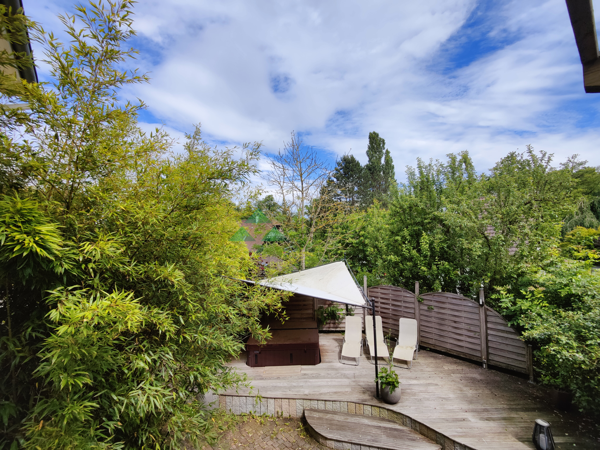 - à l'extérieur : une belle terrasse accessible depuis le séjour avec vue verdoyante. Un escalier vous mènera à une seconde terrasse à l'ambiance lounge et détente grâce à son spa. Vous pourrez également accéder à l'espace indépendant du rez-de-sol.