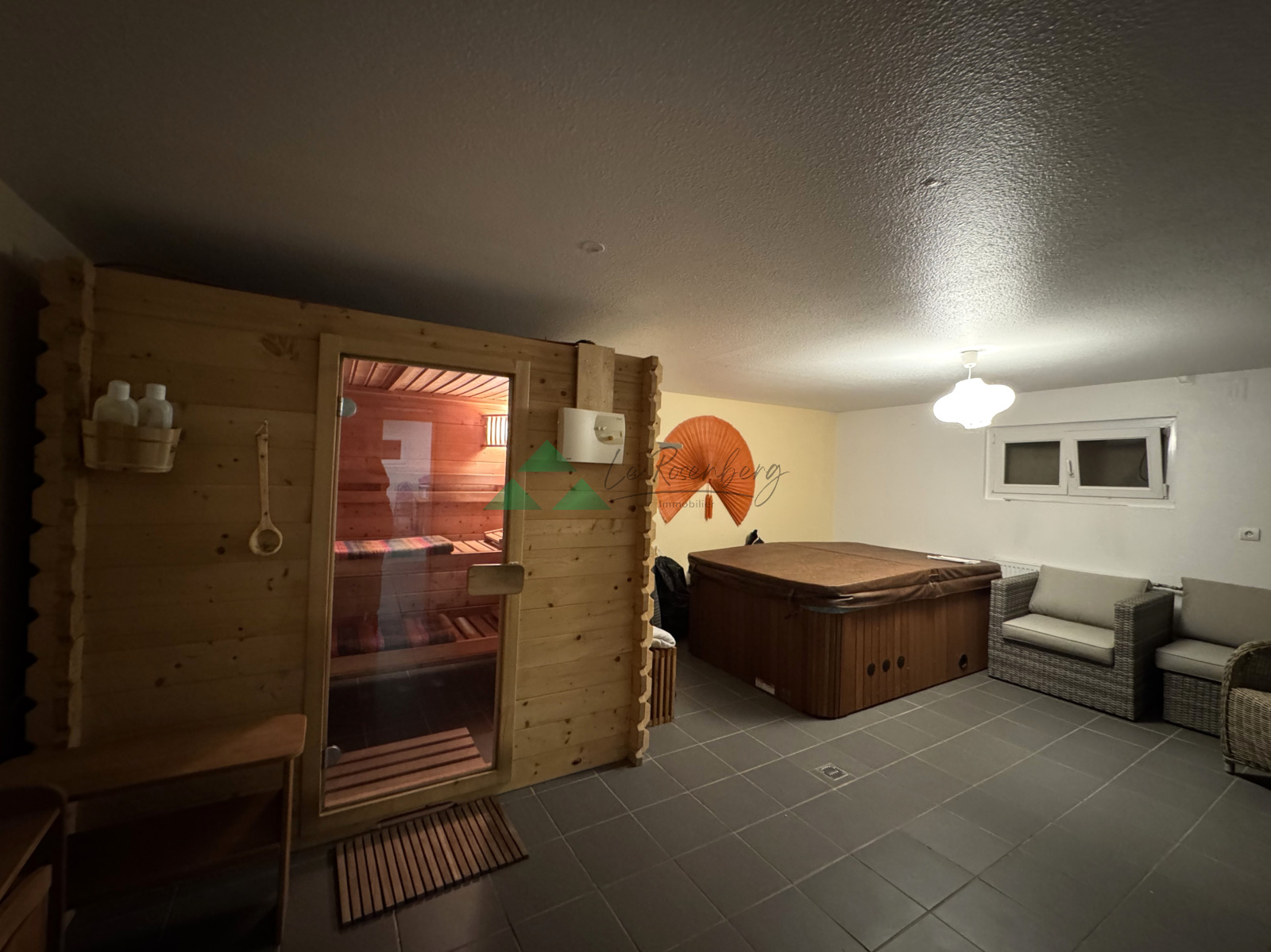 Au sous-sol: une cave, un bel espace détente avec un sauna, un jacuzzi, une douche, un espace de rangement, une chaufferie, une buanderie, une cave à vin