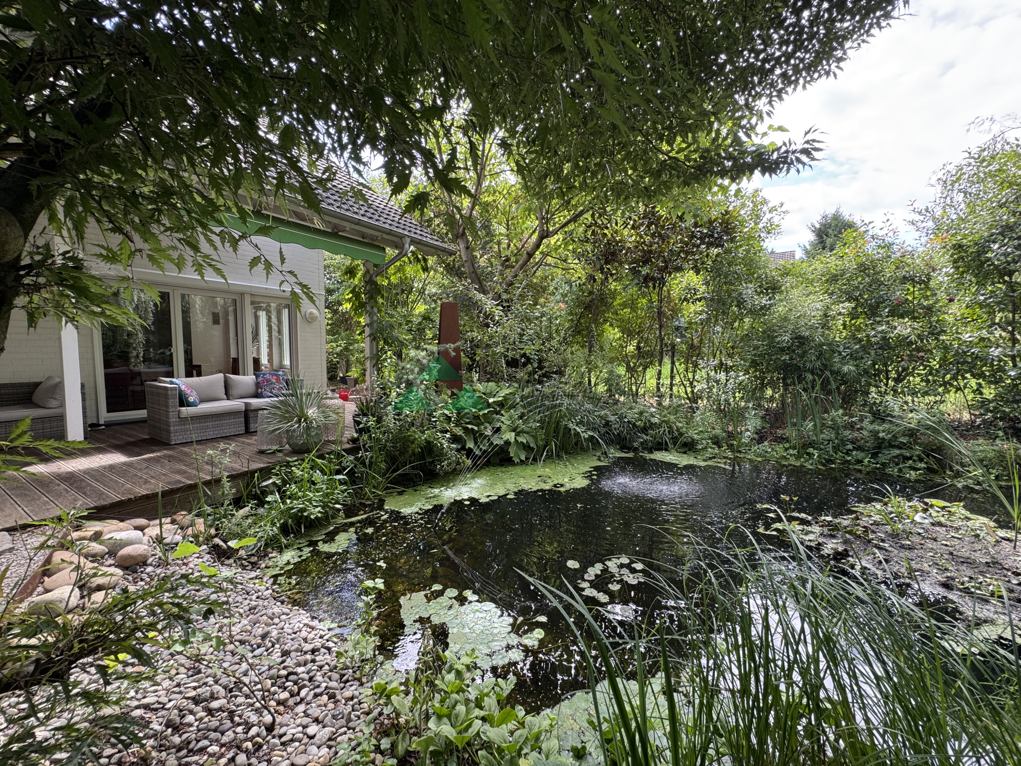 A l'extérieur: un jardin arboré, une terrasse un bassin avec une fontaine